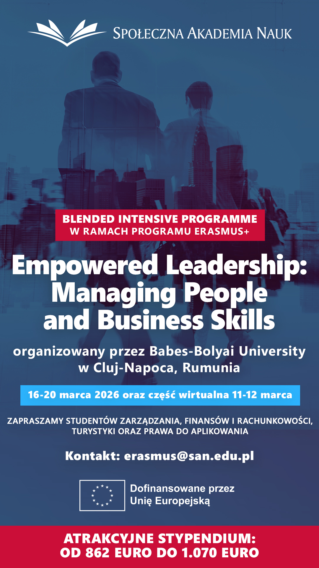 Dział Współpracy z Zagranica i Projektów Międzynarodowych ogłasza rekrutację do udziału w Mieszanym Programie Intensywnym (BIP) Empowered Leadership: Managing People and Business Skills organizowanym w ramach programu Erasmus+ przez Babes-Bolyai University w Cluj-Napoca, Rumunia. Zapraszamy do udziału studentów Zarządzania, Turystyki, Finansów i Rachunkowości oraz Prawa, którzy ukończyli pierwszy rok studiów, posługujacych się językiem angielskim na poziomie minimum B2. BIP składa się z mobilności fizycznej w terminie 16-20 marca 2026 r. oraz części wirtualnej 11-12 marca 2026 r.